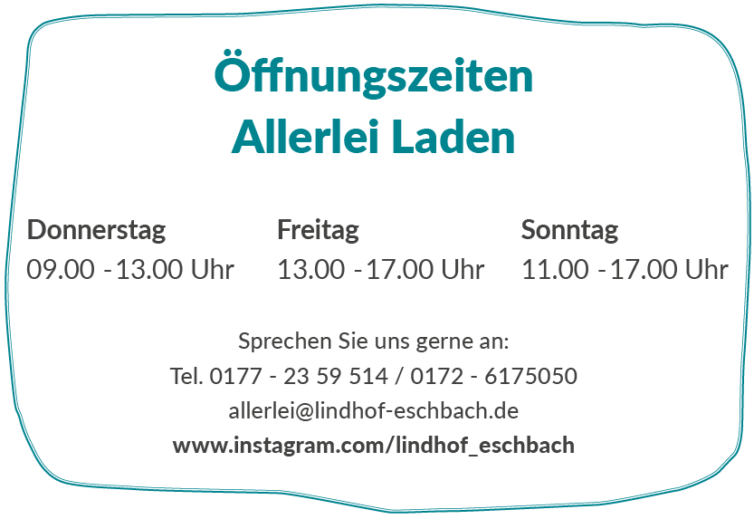 Im Allerlei Laden des Lindhof Eschbach wird in vielerlei Hinsicht ein neues Ladenkonzept realisiert: Besucher finden dort unterschiedliche Produkte und Angebote aus der Region, von genähten Mitbringseln, über Geschenk- und Dekoartikeln, zu kulinarischen Delikatessen im Glas. Das Angebot ist immer spannend, abwechslungsreich und so vielfältig wie das Usinger Land.